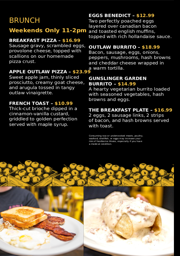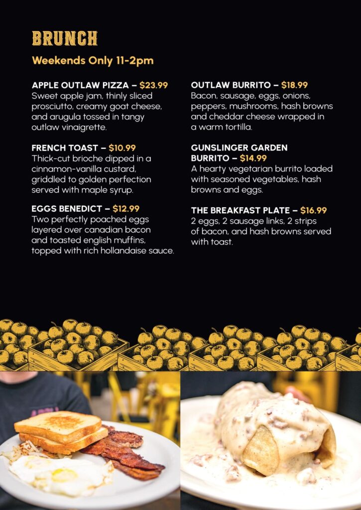 Sweet apple jam, thinly sliced prosciutto, creamy goat cheese, and arugula tossed in tangy Outlaw vinaigrette.